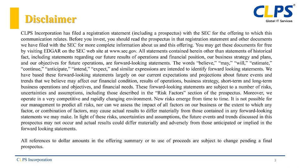 Disclaimer CLPS Incorporation has filed a registration statement (including a prospectus) with the SEC for the offering to which this communication relates . Before you invest, you should read the prospectus in that registration statement and other documents we have filed with the SEC for more complete information about us and this offering . You may get these documents for free by visiting EDGAR on the SEC web site at www . sec . gov . All statements contained herein other than statements of historical fact, including statements regarding our future results of operations and financial position, our business strategy and plans, and our objectives for future operations, are forward - looking statements . The words “believe,” “may,” “will,” “estimate,” “continue,” “anticipate,” “intend,” “expect,” and similar expressions are intended to identify forward looking statements . We have based these forward - looking statements largely on our current expectations and projections about future events and trends that we believe may affect our financial condition, results of operations, business strategy, short - term and long - term business operations and objectives, and financial needs . These forward - looking statements are subject to a number of risks, uncertainties and assumptions, including those described in the “Risk Factors” section of the prospectus . Moreover, we operate in a very competitive and rapidly changing environment . New risks emerge from time to time . It is not possible for our management to predict all risks, nor can we assess the impact of all factors on our business or the extent to which any factor, or combination of factors, may cause actual results to differ materially from those contained in any forward - looking statements we may make . In light of these risks, uncertainties and assumptions, the future events and trends discussed in this prospectus may not occur and actual results could differ materially and adversely from those anticipated or implied in the forward looking statements . All references to dollar amounts in the offering summary or to use of proceeds are subject to change pending a final prospectus . C L PS Incorporation 3