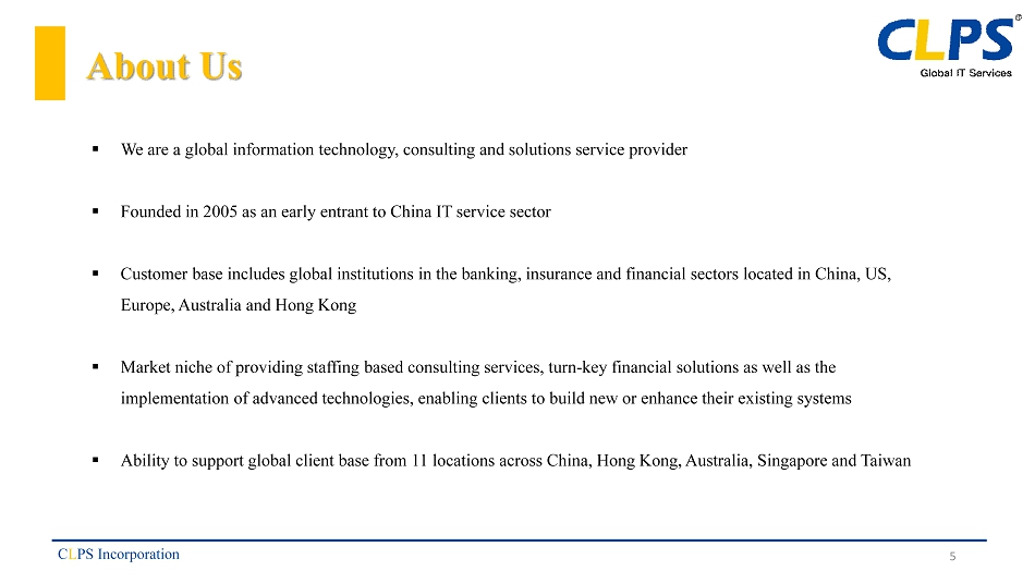 Offering Summary Issuer/Ticker CLPS Incorporation Type of Offering Initial Public Offering Exchange NASDAQ Capital Market Symbol CLPS Shares Outstanding Pre - offering 11 , 290 , 000 Expected Offering Size: 2 , 000 , 000 Shares Over - allotment Option 300 , 000 Shares Price Range $ 5 . 00 to $ 5 . 50 per Share Use of Proceeds Global expansion, working capital and general corporate purposes, R&D and talent development C L PS Incorporation 4
