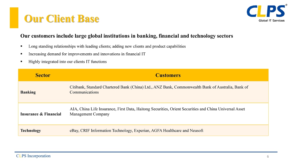 About Us ▪ We are a global information technology, consulting and solutions service provider ▪ Founded in 2005 as an early entrant to China IT service sector ▪ Customer base includes global institutions in the banking, insurance and financial sectors located in China, US, Europe, Australia and Hong Kong ▪ Market niche of providing staffing based consulting services, turn - key financial solutions as well as the implementation of advanced technologies, enabling clients to build new or enhance their existing systems ▪ Ability to support global client base from 11 locations across China, Hong Kong, Australia, Singapore and Taiwan C L PS Incorporation 5