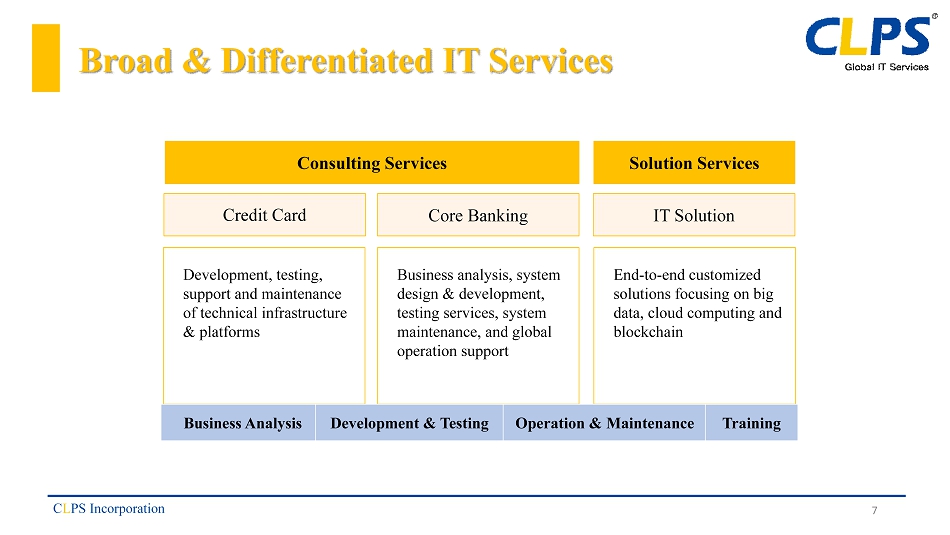 Our Client Base Our customers include large global institutions in banking , financial and technology sectors ▪ Long standing relationships with leading clients; adding new clients and product capabilities ▪ Increasing demand for improvements and innovations in financial IT ▪ Highly integrated into our clients IT functions C L PS Incorporation Sector Customers Banking Citibank, Standard Chartered Bank (China) Ltd., ANZ Bank, Commonwealth Bank of Australia, Bank of Communications Insurance & Financial AIA, China Life Insurance, First Data, Haitong Securities, Orient Securities and China Universal Asset Management Company Technology eBay, CRIF Information Technology, Experian, AGFA Healthcare and Neusoft 6