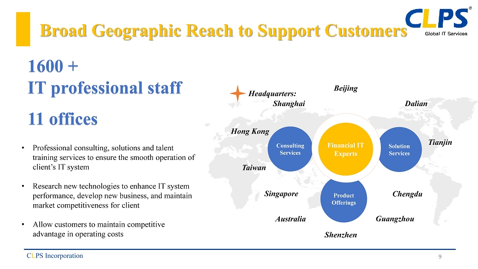 Fulfilling Customer Needs in a Cost - effective Manner C L PS Incorporation 8 Multi - faceted approach to support and consulting in a scalable and highly - efficient model ▪ Provide management level staff – Deploy senior level staff to manage critical IT platforms for clients ▪ Internally develop advanced IT products – Leverage R&D capabilities – Focus on platforms for blockchain , big data, and mobile apps – Development centers to serve clients in various geographic locations in China, Hong Kong, Taiwan, Singapore and Australia ▪ Provide highly trained staff – Experience and training in China, a market leader in technology innovation – China offers cost competitive IT personnel ▪ Provide offshore development center (ODC) services – Experience and ability to securely provide ODC services to clients