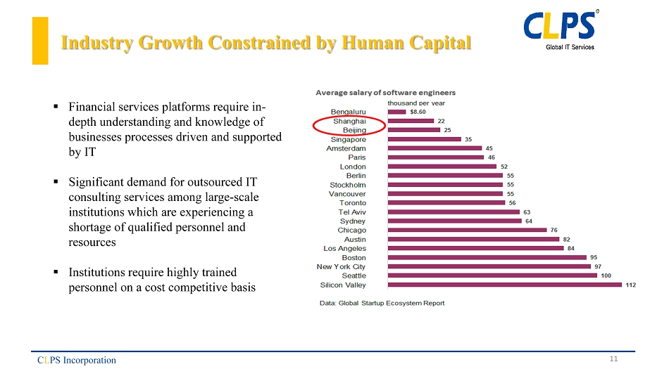 Increasing Demand for IT Services in PRC 1. Data Source: The Ministry of Industry and Information Technology, National Bureau of Statistics of China C L PS Incorporation ▪ IT Services industry revenues in China banking is anticipated to grow at an annualized rate of 21. 2 % in the next three years, to total $9.0 billion in 2020 ▪ IT services demand driven by China’s economic growth and continued deployment of IT hardware and software ▪ PRC software industry revenues tripled from 2010 to 2016, reaching $723 billion ▪ During 2011 - 2016, the industry’s compound annual growth rate reached 24.3% 1 0 300 600 900 2007 2008 2009 2010 2011 2012 2013 2014 2015 2016 Revenue (in billion USD 㸧 Revenue of Software Business in China 10 0.0 2.5 5.0 7.5 10.0 China Banking IT Services Market Software and Services (in billion USD) Software Services