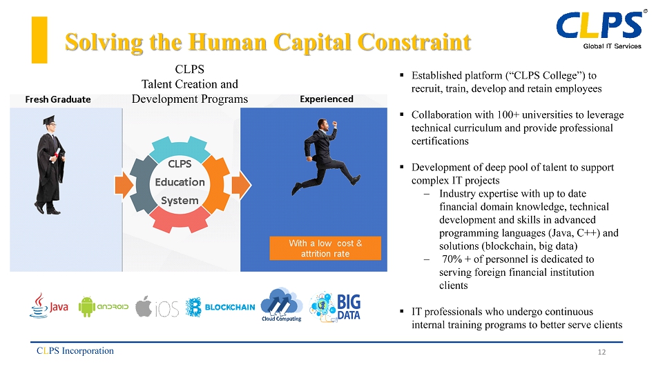 Industry Growth Constrained by Human Capital C L PS Incorporation ▪ Financial services platforms require in - depth understanding and knowledge of businesses processes driven and supported by IT ▪ Significant demand for outsourced IT consulting services among large - scale institutions which are experiencing a shortage of qualified personnel and resources ▪ Institutions require highly trained personnel on a cost competitive basis 11