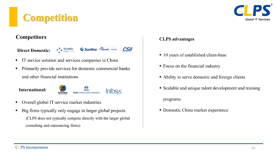 Significant Opportunities for Growth through Product, Geographic & Customer Expansion C L PS Incorporation 14 ▪ Product Expansion □ Strong revenues driven by staffing based consulting service o Recent addition of IT solution services » R&D focused in key banking innovations for b lockchain , cloud computing and big data o Expanding business coverage from technical services to business operation services ▪ Geographic Expansion □ 2015 expansion into Southeast Asia is beginning to generate returns o Servicing existing clients in their Southeast Asia locations (Singapore, Malaysia, Thailand) o Leveraging existing client relationships to support their Southeast Asia IT requirements o Access to technology & processes developed in China of particular interest in areas such as Japan ▪ Customer Expansion □ Addition of new customers from both domestic and overseas financial institutions ▪ M&A □ Potential for cost effective acquisitions
