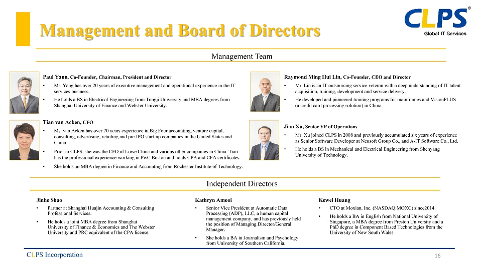 Independent Directors Management Team Management and Board of Directors Paul Yang Co - Founder, C hairman , President and Director • Mr. Yang has over 20 years of executive management and operational experience in the IT services business. • He holds BS in Electrical Engineering from Tongji University and MBA degrees from Shanghai University of Finance and Webster University. Tian van Acken CFO • Ms. van Acken has o ver 20 years experience in Big Four accounting, venture capital, consulting, advertising, retailing and pre - IPO start - up company in the United States and China. • Prior to CLPS, CFO of Lowe China and various other companies in China. Tian has the professional experience working in PwC Boston and holds CPA and CFA certificates. • She holds an MBA degree in Finance and Accounting from Rochester Institute of Technology. Raymond Ming Hui Lin Co - Founder , CEO and Director • Mr. Lin is a IT outsourcing service veteran with a deep understanding of IT talent acquisition, training, development and service delivery. • He d eveloped and pioneered training programs for mainframes and VisionPLUS (a credit card processing solution) in China. Jian Xu Senior VP of Operations • Mr. Xu joined CLPS in 2008 and previously accumulated six years of experience as Senior Software Developer at Neusoft Group Co., and A - IT Software Co., Ltd. • He h olds a BS in Mechanical and Electrical Engineering from Shenyang University of Technology. Jinhe Shao • Partner at Shanghai Huajin Accounting & Consulting Professional Services. • He holds a joint MBA degree from Shanghai University of Finance & Economics and The Webster University and PRC equivalent of the CPA license. Kathryn Amooi • Ms. Amooi holds various positions at Automatic Data Processing (ADP),LLC, a human capital management company, including as Senior Vice President and Managing Director/General Manager. • She holds a BA in Journalism and Psychology from University of Southern California. Kewei Huang • CTO at Moxian , Inc. (NASDAQ:MOXC) since2014 . • He holds a BA in English from National University of Singapore, a MBA degree from Preston University and a PhD degree in Component Based Technologies from the University of New South Wales. C L PS Incorporation 16